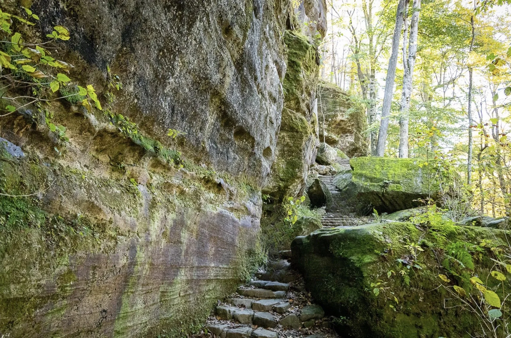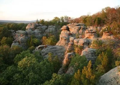 At Cave-In-Rock, atop the high bluffs overlooking the scenic Ohio River, the heavily wooded park is named for the 55-foot-wide cave that was carved out of the limestone rock by water thousands of years ago. The park contains hiking trails of moderate difficulty for exploration and appreciation of tranquil forests and inspiring views.